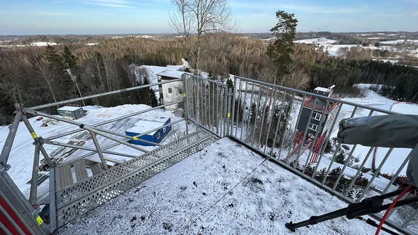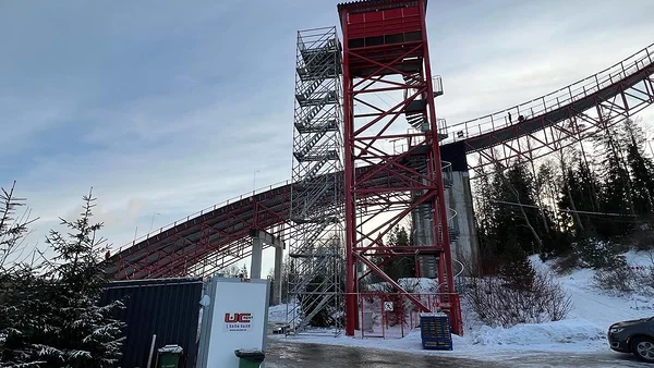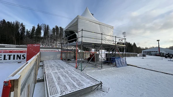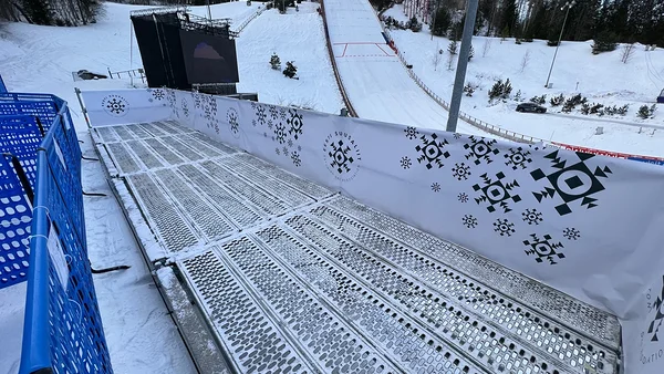 At the ski jump, we installed an 18 m high judges’ platform compliant with international competition requirements. In the finish area, we built a platform with a 5 × 5 m tent for TV broadcasts, as well as several larger and smaller platforms for cameras and photographers.