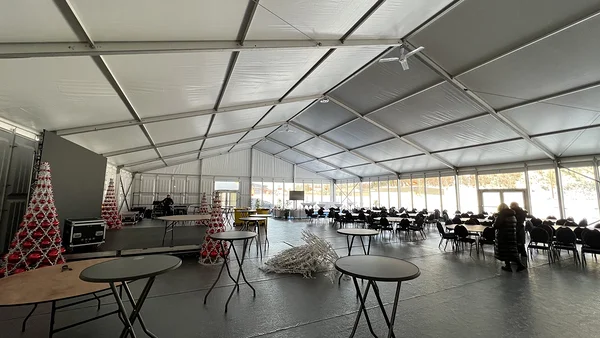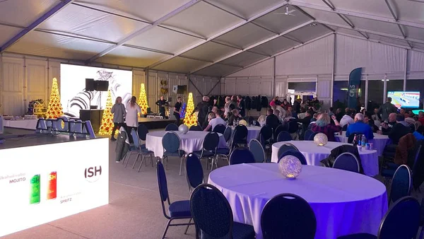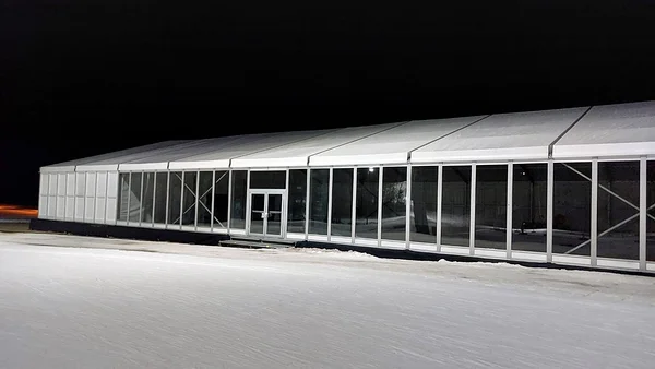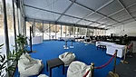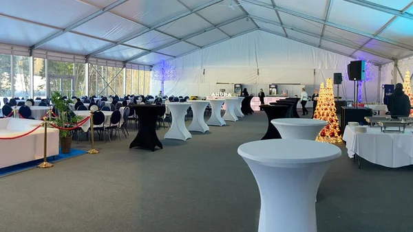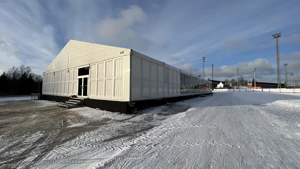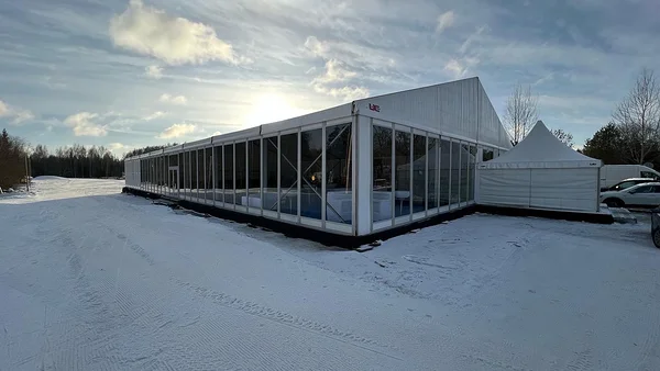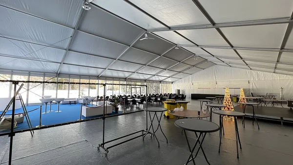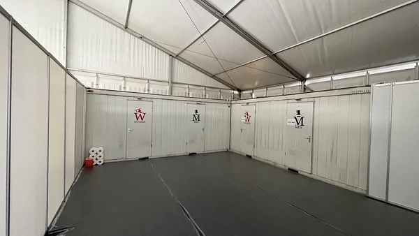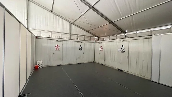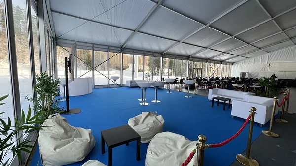 We installed a 21 × 40 m main tent with flooring, a separate entrance tent, and a reliable heating solution to ensure comfortable conditions even in challenging weather. As part of the tent complex, we also built a dedicated area for WC facilities, which we supplied and installed.